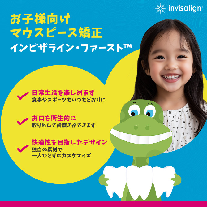 インビザライン・ファーストは、成長過程のお子さんに用いるマウスピース矯正です。6〜10歳頃で、永久歯と乳歯が混在する混合歯列期に用います。インビザライン・ファーストは、取り外しのできる矯正治療として、多くの方に選ばれています。